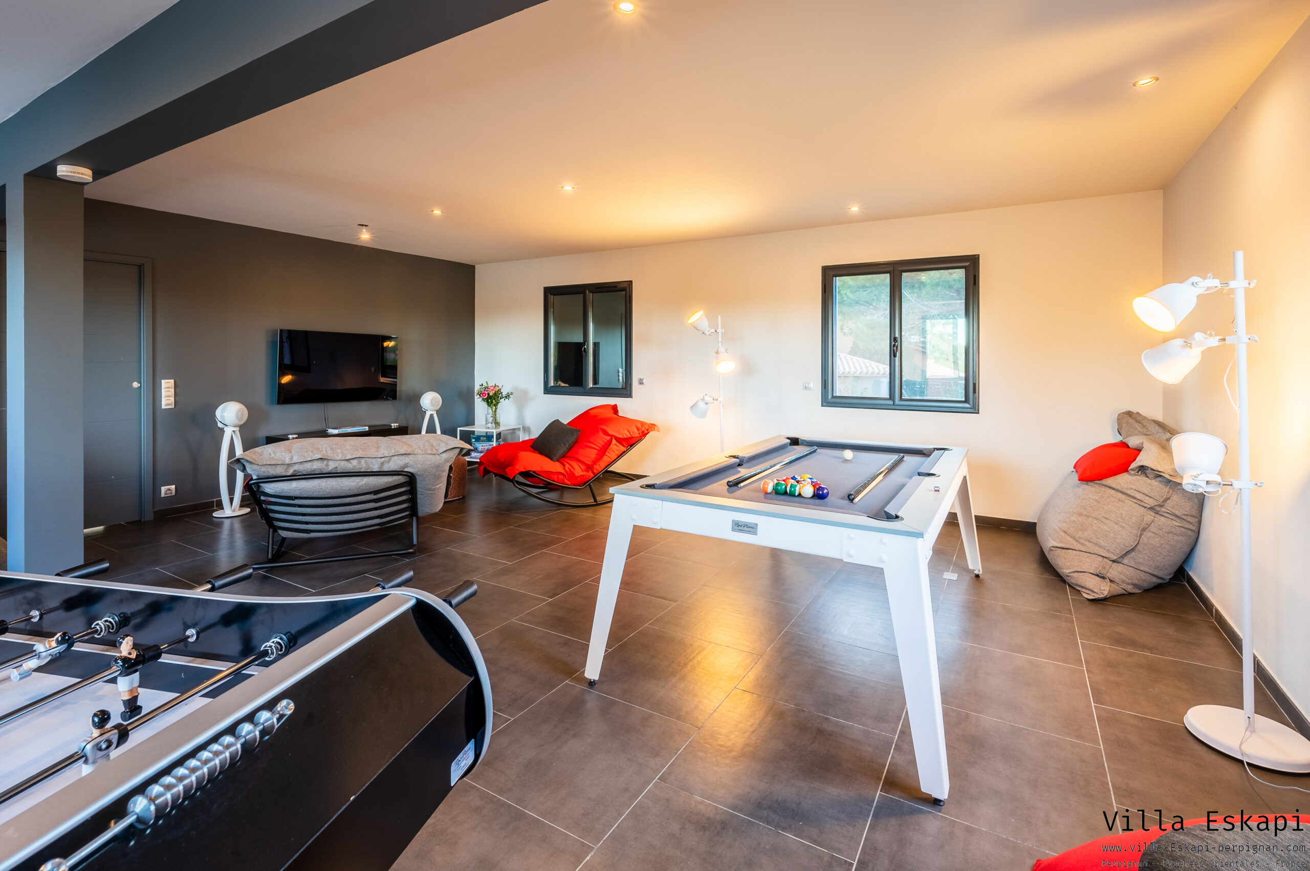 Grande salle de jeux avec billard, baby foot, télévision 140 cm avec sonorisation Cabasse et fauteuils confortables Fatboy afin de vous apporter différentes possibilités (repos ou divertissement).